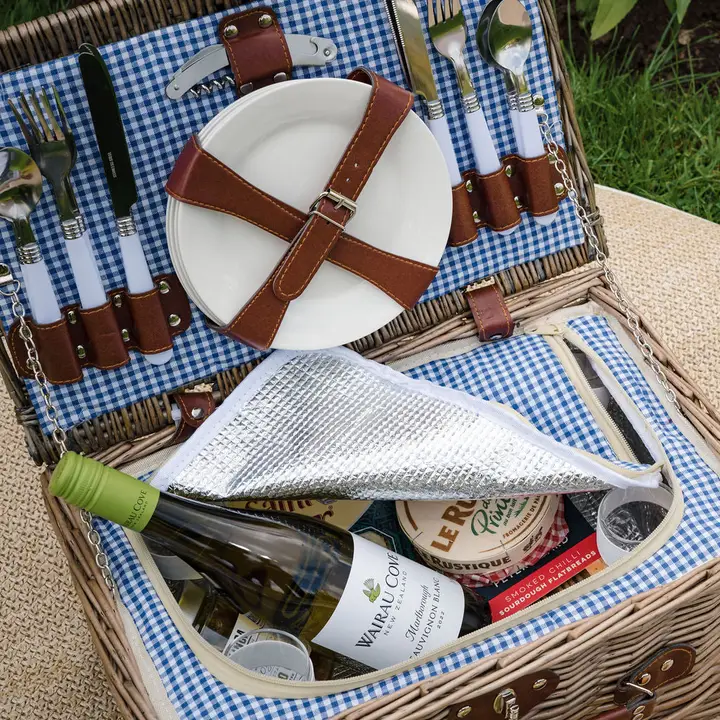 4 Person Blue Gingham Lined Wicker Picnic Basket