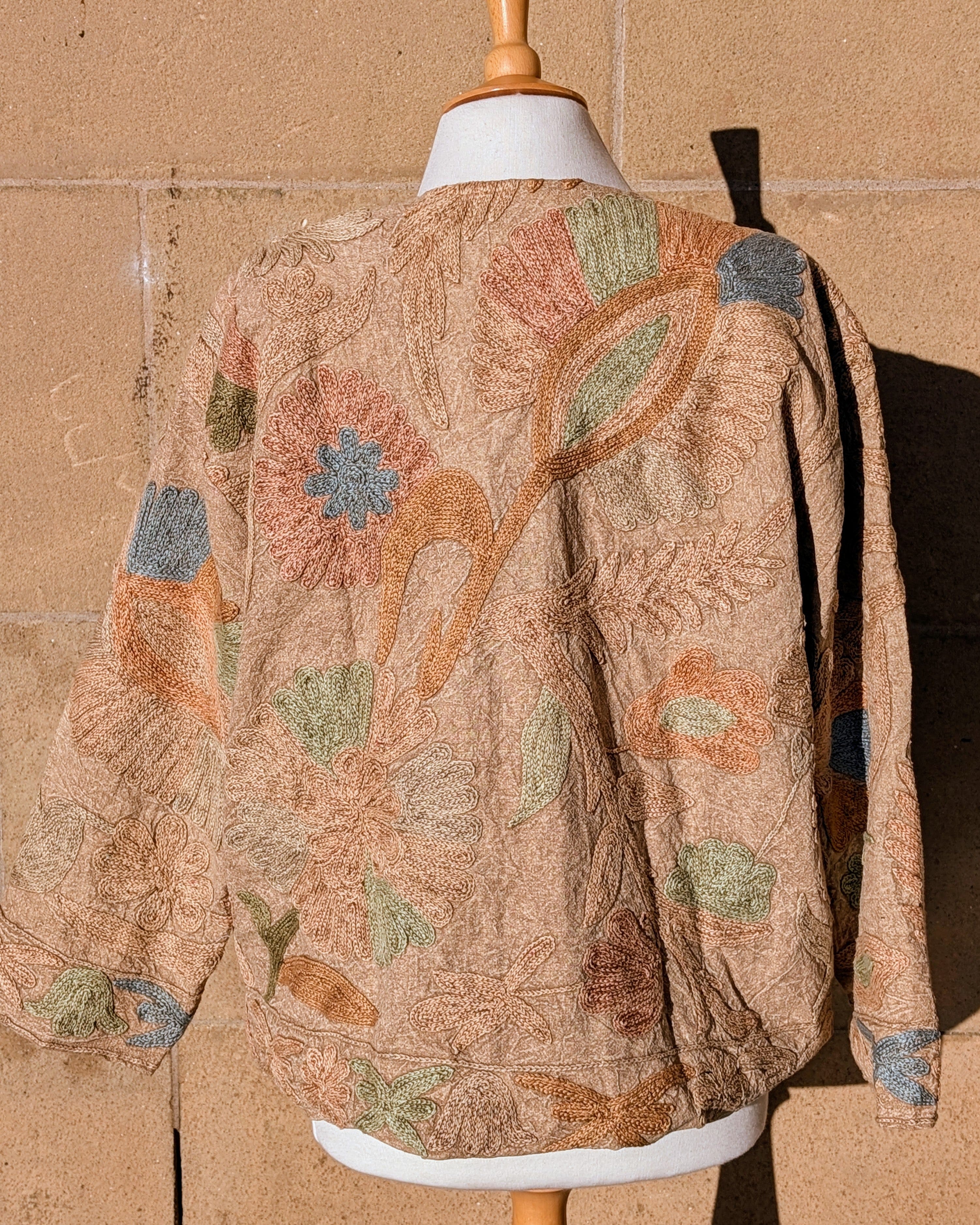 Our exquisite handmade Suzani embroidered jackets are handmade works of art. Each piece is unique, having been made from a handmade tapestry. We have designed each piece in a kimono style with an open neckline making them extremely easy to wear. Just throw on with a pair of jeans or dress up for going out. They are very versatile.